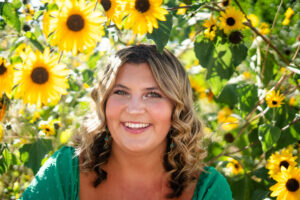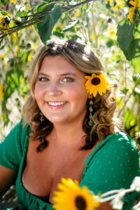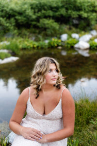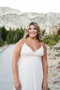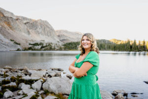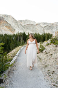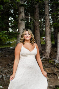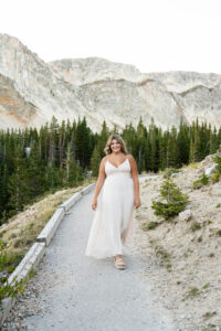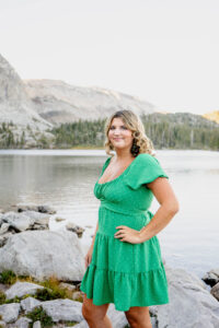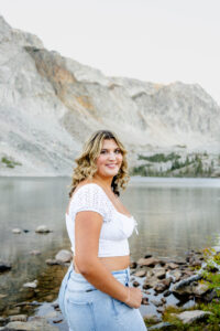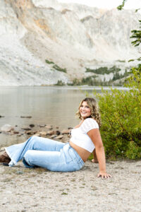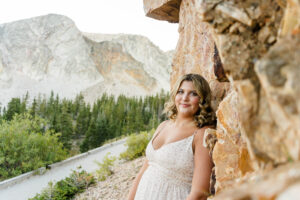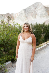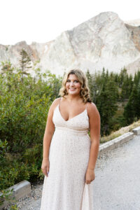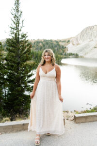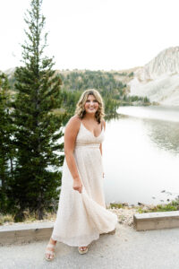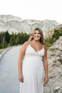 The session started out in the City of Laramie, Wyoming, right on a sidewalk next to some beautiful sunflowers. Although the sun was higher in the sky and fairly intense, it made for some very glowy photos. The beautiful flowers made her dress pop in an amazing way. After finishing our final shots at this setting we started our drive to the Snowy Range Mountains as the sun started descending coming into the perfect golden hour.